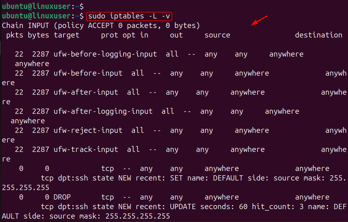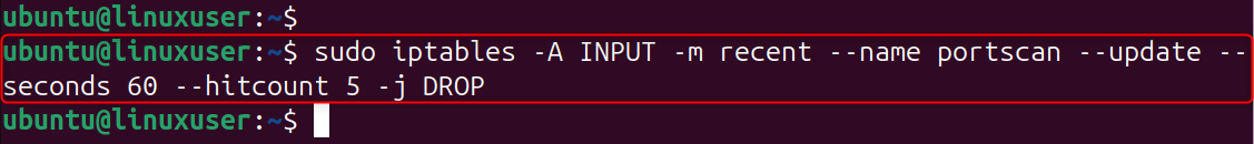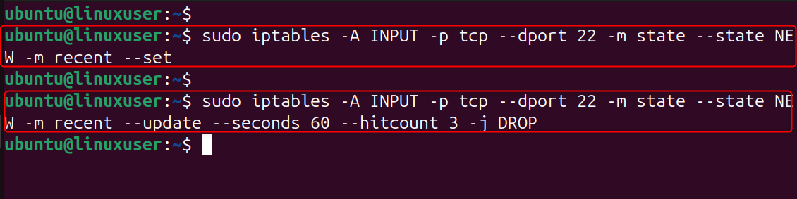 This rule limits SSH connections to three per minute per IP. This stops brute-force tools that attempt dozens of password guesses per second. If an IP exceeds the limit, iptables drops its packets, instantly stopping attacks.