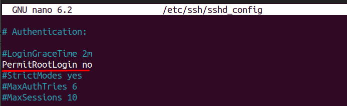 Inside the file, find the line that starts with PermitRootLogin. If it’s commented out with #, remove the # and set the value to no: