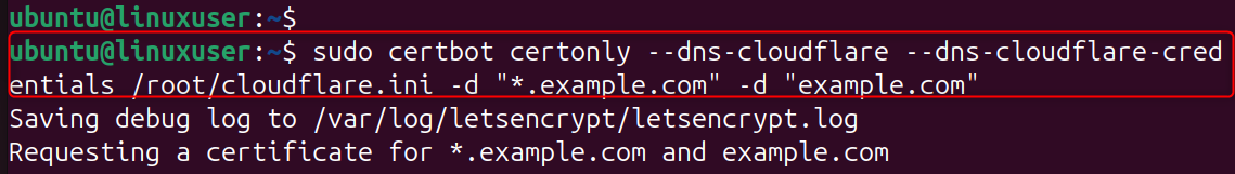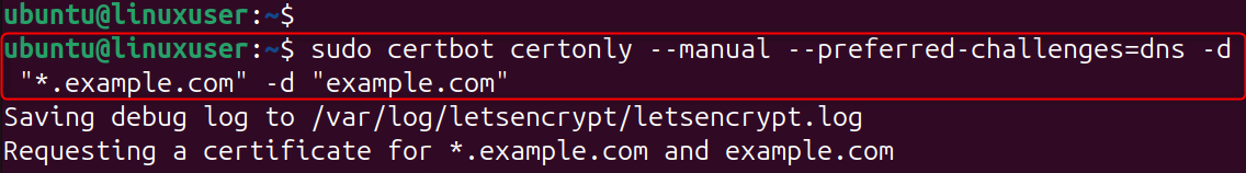 - -d "*.example.com"Requests wildcard cover for all subdomains.