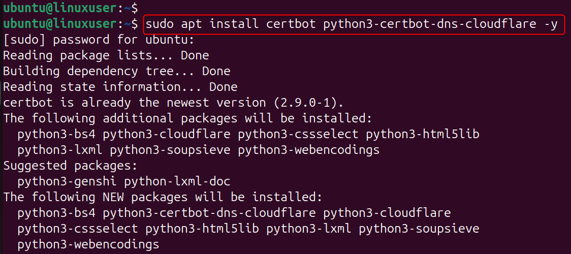 - python3-certbot-dns-cloudflare - DNS plugin for automatic TXT record creation