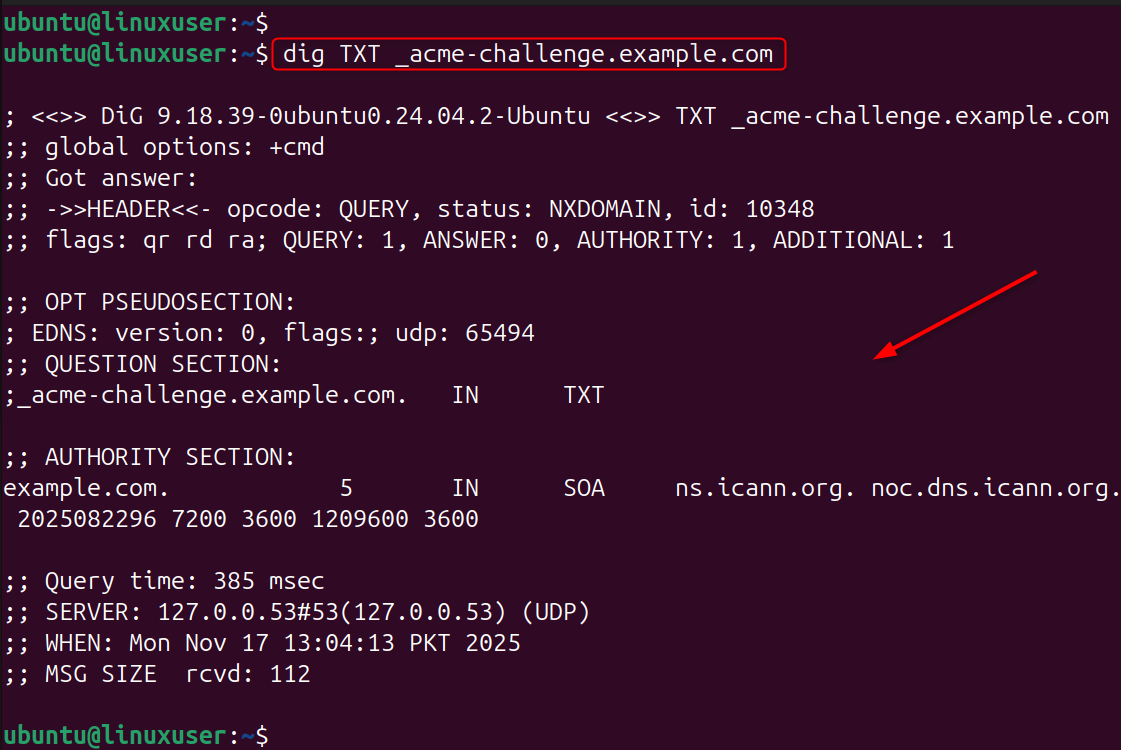 Let's Encrypt verifies this TXT to ensure you own the domain. Verify DNS propagation (optional but recommended):