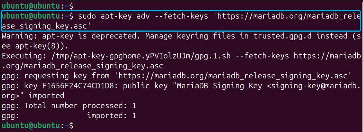 Type the “apt-key” command to import the GPG Key for MariaDB so that we can be sure that we’re accessing a trusted repository.