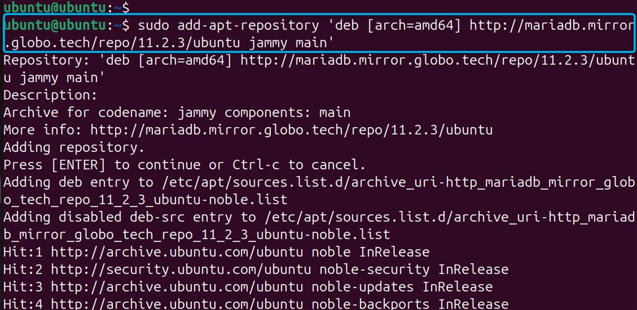 Now, add the MariaDB repo to the system. Note that you will have to replace “11.2.3” in the above command with the version that you want to install: