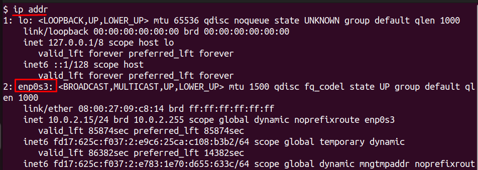 In this example, enp0s3 is the active interface. Note this name carefully because you will use it in all Wondershaper commands.