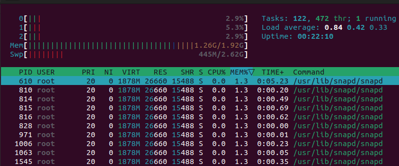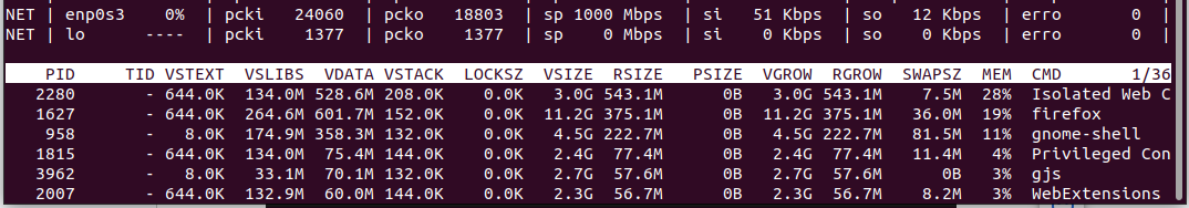 If you press m, the memory view becomes active. This highlights how RAM and swap space are being allocated across different processes: