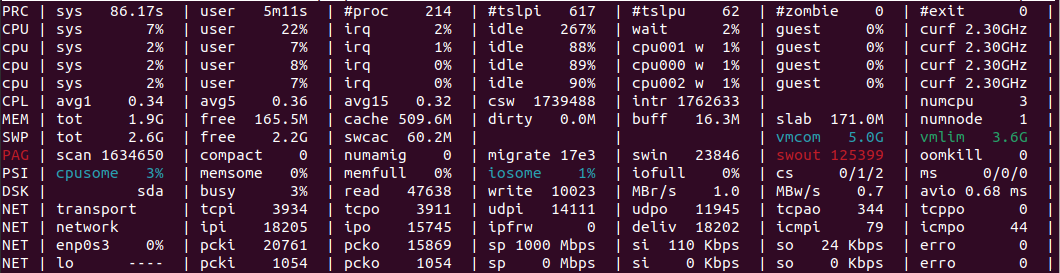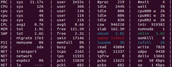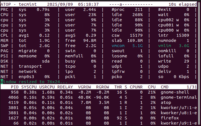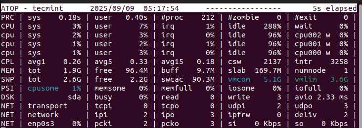 This opens a detailed real-time interface showing CPU, memory, disk, and network usage. Unlike simple process monitors, atop collects extended statistics, which makes it a valuable tool for tracking how resources are being consumed over time.