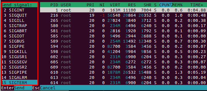 To stop a process, highlight it and press F9. This allows you to kill the selected process by sending a signal, which is often the quickest way to deal with unresponsive tasks: