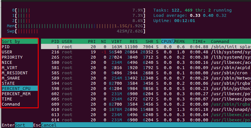 When you press F6, you can change the sorting criteria. For example, you might choose to view processes sorted by memory usage instead of CPU: