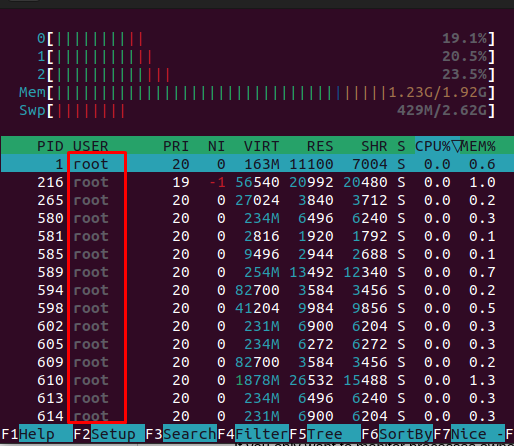 This launches htop, showing only the processes with those IDs, making it easier to isolate a service.