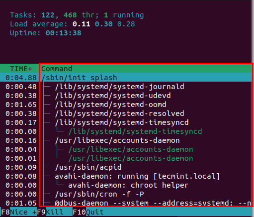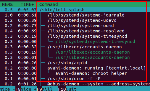 If you want to view processes in a hierarchical order, press F5 to switch into tree view. This makes it easy to see which processes were started by others: