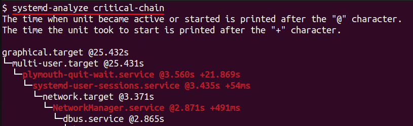 This command shows a dependency chain — basically a timeline of which service started first, which ones waited, and how long each step took. The output is shown as a tree with timestamps, so you can clearly see which service is causing delays for others.
