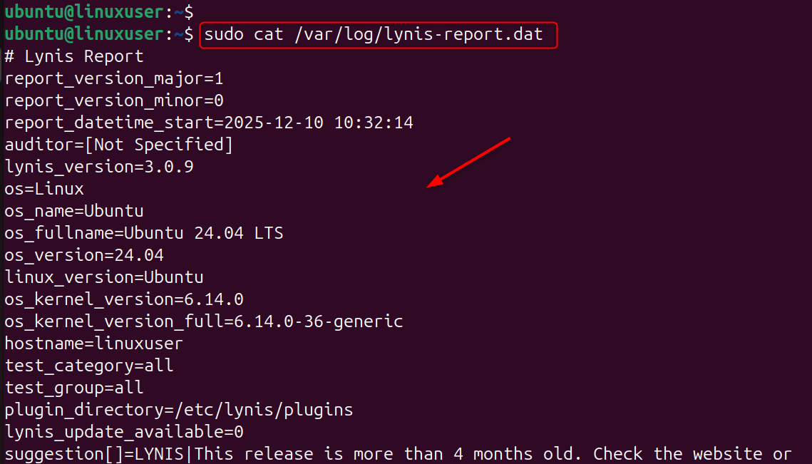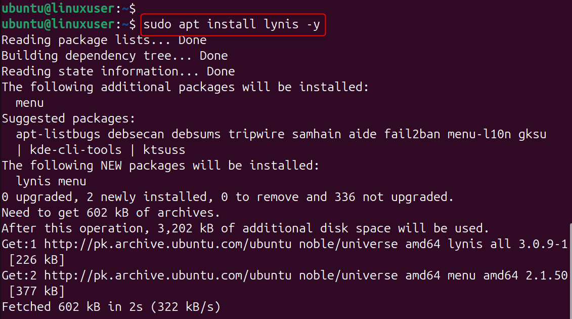 This command will update your package list and install Lynis directly from the official Ubuntu/Debian repositories. Lynis can be used to perform audits immediately after installation.