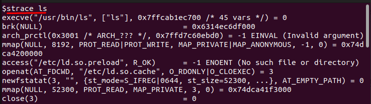 This prints all system calls used by ls to read the current folder. You can scroll through the output and see calls like openat(), read(), and close(). This is exactly what you would do when debugging a crashing program — run it under strace and check what happened just before it stopped working.