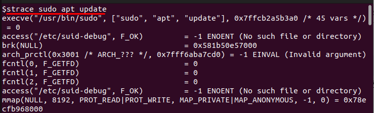 Watch the output for a few seconds, then press CTRL+C to stop strace and the command. This helps you see real activity and lets you capture screenshots without waiting for a crash to happen.